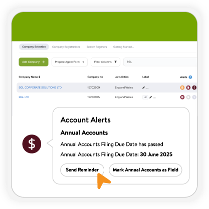 New alerts (due, upcoming, passed) help track statutory obligations more effectively and reduce the risk of missed deadlines or penalties.