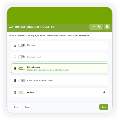 A new Billing Contact toggle has been added under Filter Columns in the Confirmation Statement screen.